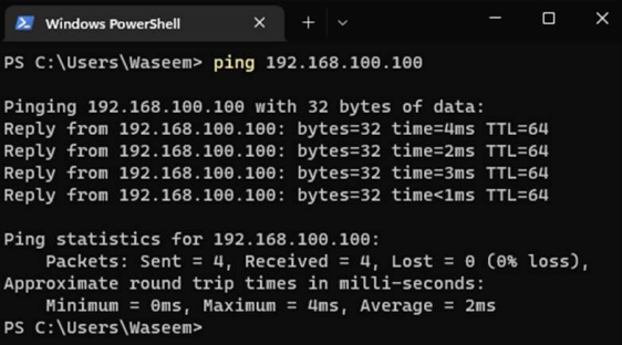 We can verify the networking setup by pinging the IP 192.168.100.100 from Windows 11. If the ping is successful, it confirms that the network configuration is correctly in place, as shown in Figure 5.