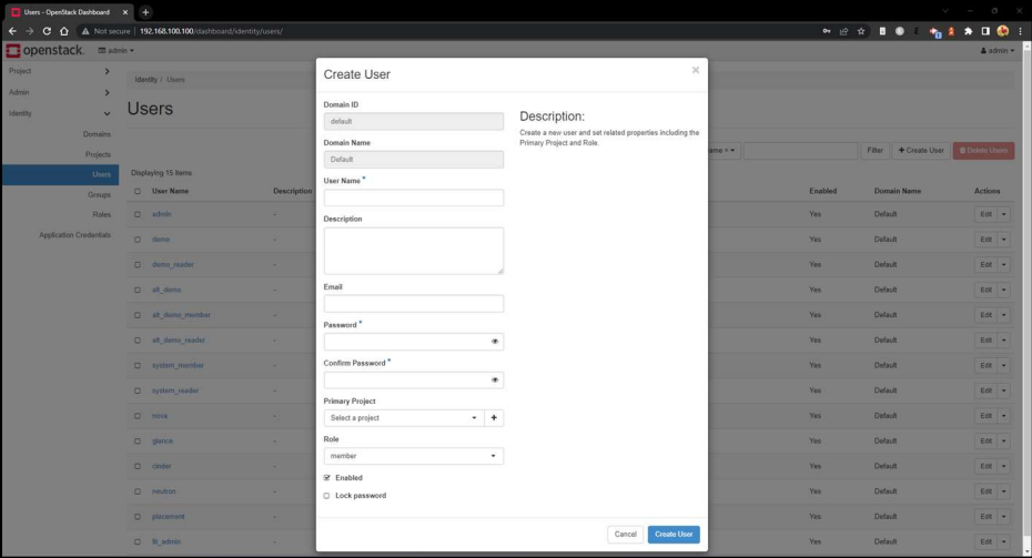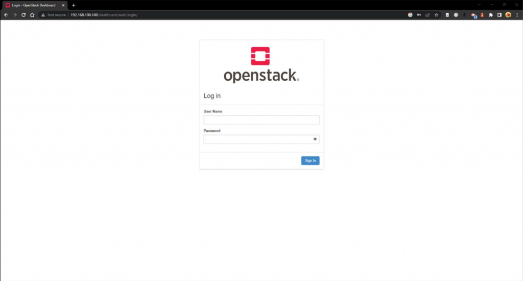 You can log in to the OpenStack Horizon dashboard through your web browser on the Windows host (see Figure 7). Use the address displayed in Figure 6 to access it.