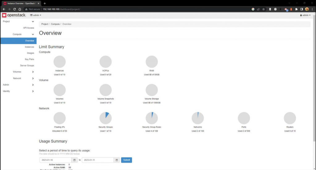Once logged in, you will see the Horizon dashboard interface and an overview of the system resources managed by the current OpenStack Installation , as illustrated in Figure 8.
