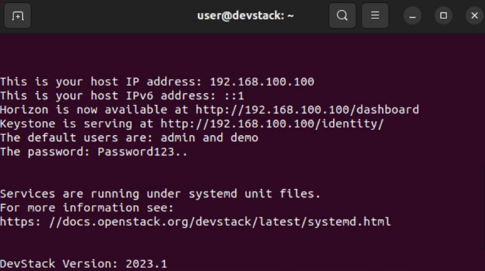 The installation process takes about 20-30 minutes. Once completed, the terminal will display URLs for services like Horizon, along with other OpenStack components as shown in Figure 6