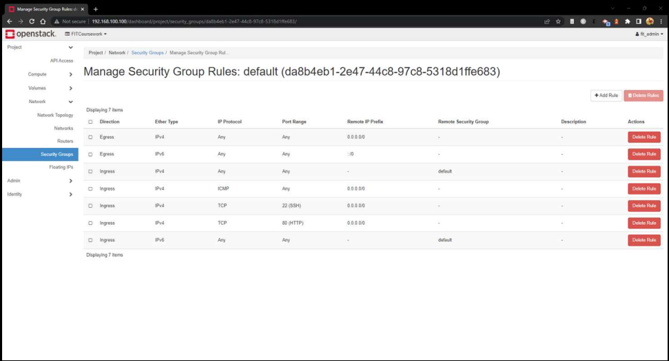 A security group configures firewall rules to manage traffic. Modify the default security group by adding these ingress rules (Figure 12):