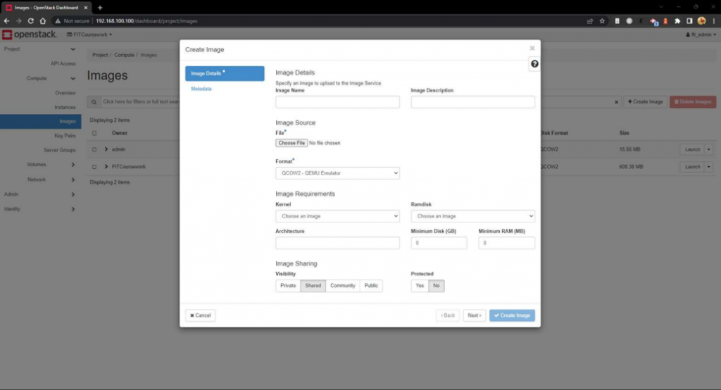 Upload an operating system image. We used the Ubuntu Focal Cloud Image in QCOW2 format (Figure 15).