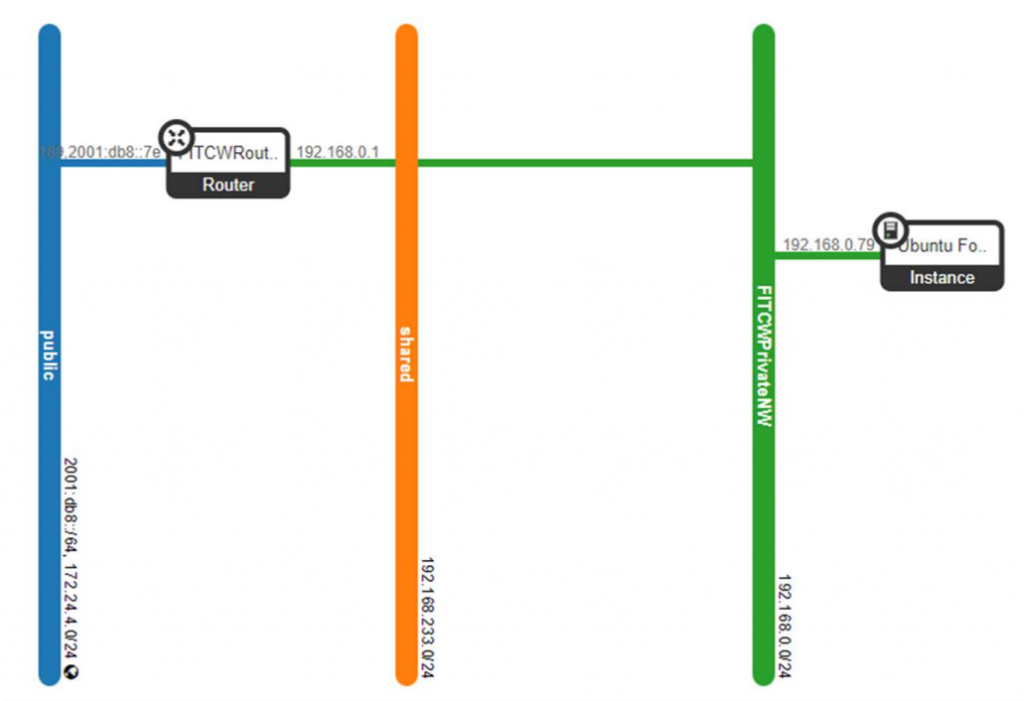 Navigate to the Instance Dropdown menu. Select the option to Associate Floating IP. Assign the floating IP address 172.24.4.41 to the instance. After this step, the network topology will update to reflect the changes, as shown in Figure 18. This floating IP allows external access to the L2 instance.