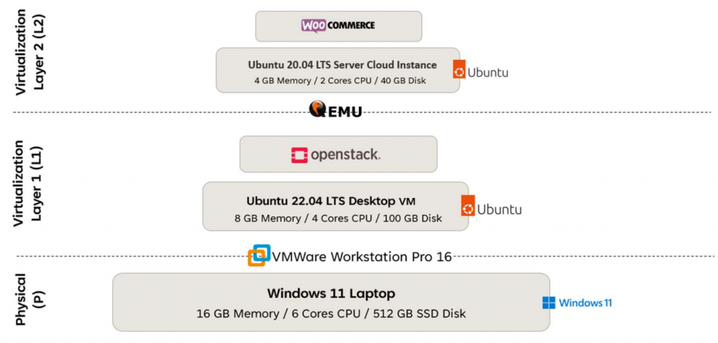 - Virtualization Layer 2 (L2): This runs the e-commerce app inside OpenStack. The L2 layer runs on an Ubuntu 20.04 LTS Server Cloud Instance.