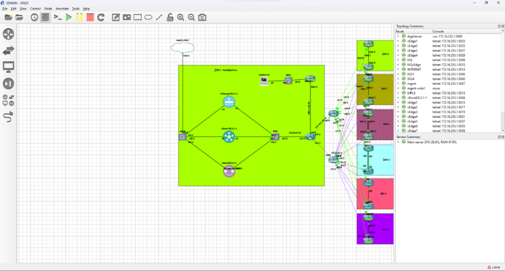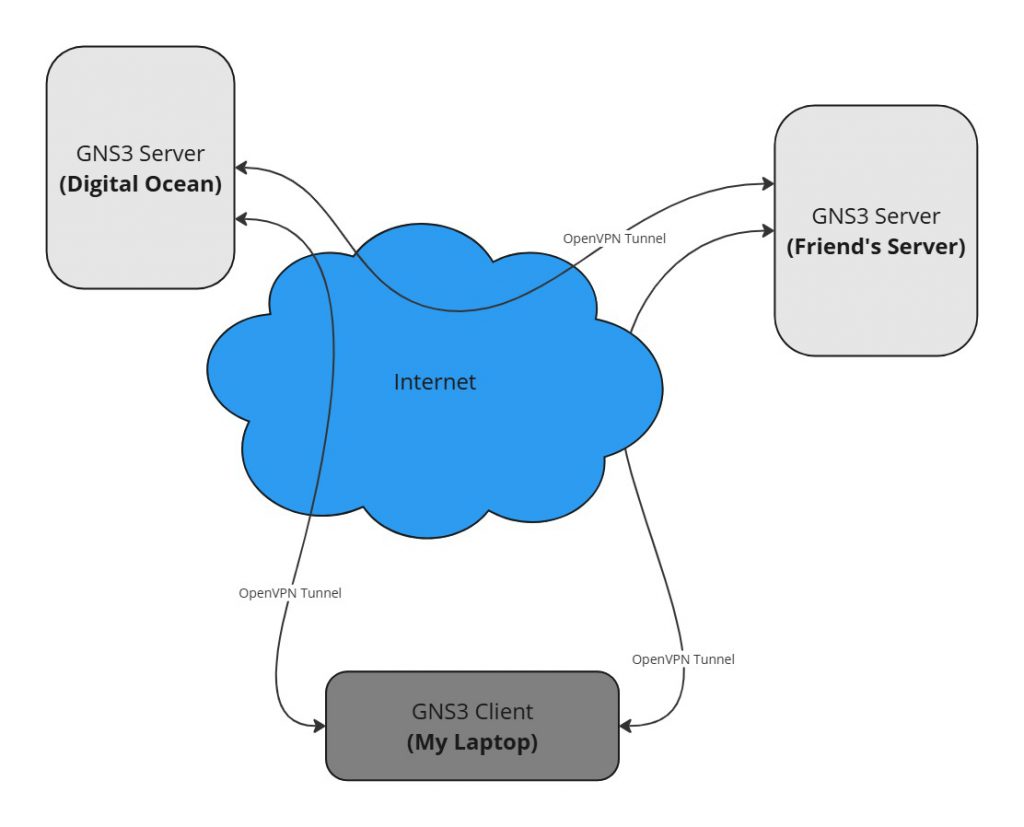 To interconnect these disparate resources, I implemented a VPN mesh using OpenVPN. This setup created a seamless network environment, enabling appliances hosted on different GNS3 VMs to communicate as though they were on the same local network. The architecture’s core components included VPN connectivity, distributed GNS3 instances, and optimized resource allocation based on the workload demands.